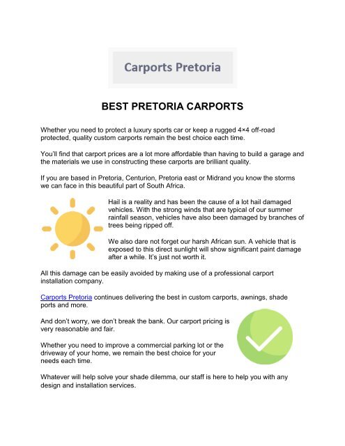 It is not always practical to have a garage present on. Waterproof with full warranty. Click below to navigate to the area that is closest to you to get your free price list and quote online today. View our carports and roofs gallery below in centurion midrand pretoria tshwane and gauteng.